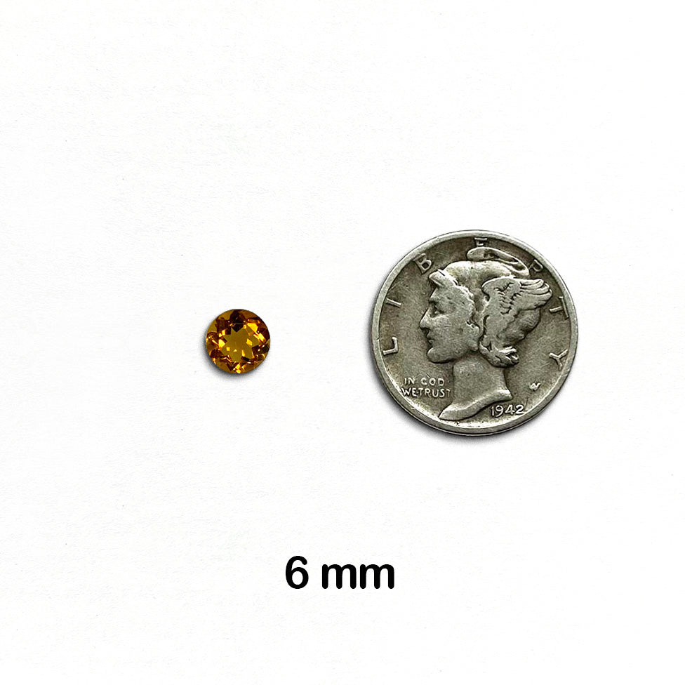 One Round 6mm Madeira Citrine Faceted Gemstone. The finest color in citrine. Citrine is a quartz gemstone that is 7 on the MOHs hardness scale and it is also very tough. Plenty of brilliance on these!